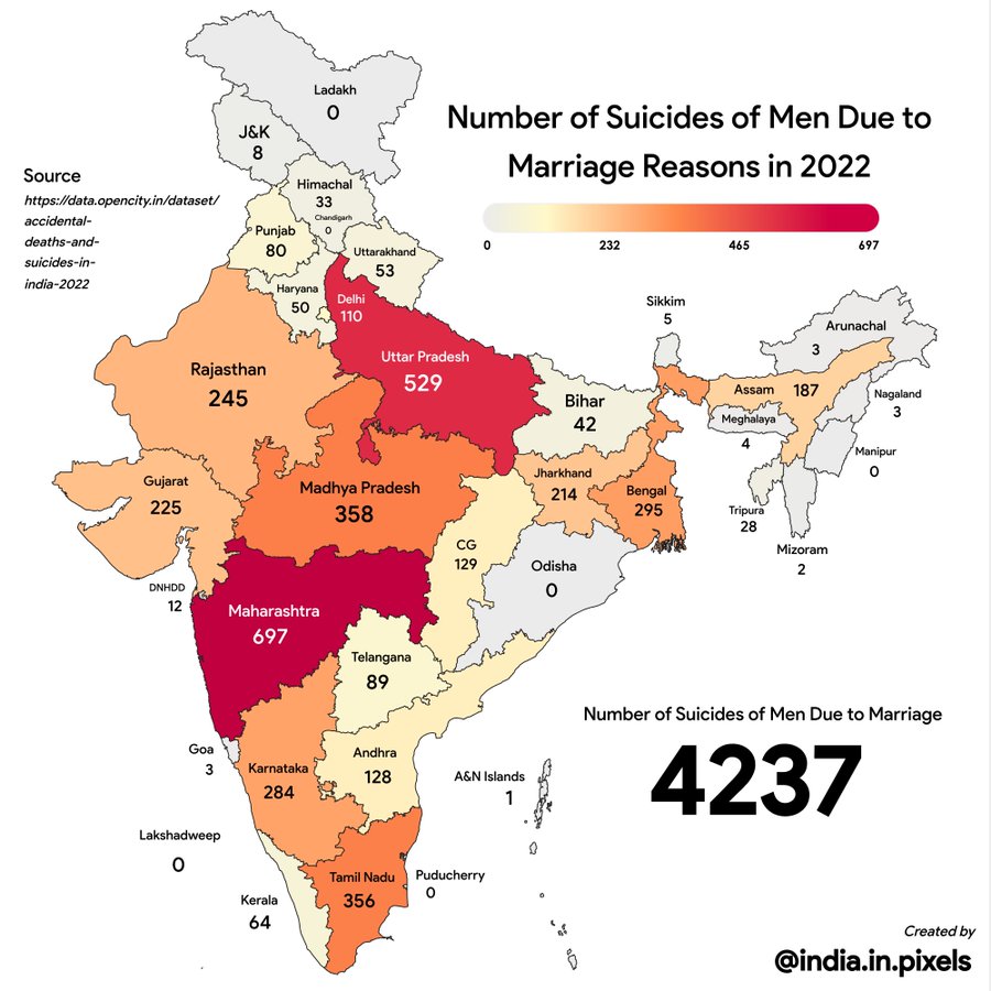 At least 4,237 Indian men took their own lives due to marriage related reasons in 2022, according to data accessed by India in Pixels by Ashris. Maharashtra with 697 cases saw the highest number of such suicides in 2022. This is followed by UP (529), MP (358), Tamil Nadu (356), West Bengal (295), Karnataka (284), Rajasthan (245) and Gujarat (225).